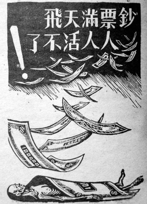對(duì)于通貨膨脹,當(dāng)年老百姓曾這樣描述:國(guó)民黨政府發(fā)行的法幣,1937年100元可買(mǎi)到兩頭牛,1938年變?yōu)橐活^牛,1939年可買(mǎi)一頭豬,1941年能買(mǎi)到一袋面粉,1943年能買(mǎi)一只雞,1945年能買(mǎi)一個(gè)煤球,到了1948年,只能買(mǎi)到幾粒大米。