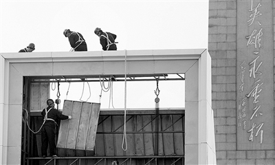 上午8時(shí)許,記者在人民英雄紀(jì)念碑前看到,工人正在組裝放置孫中山先生畫像的背板相框,并且將相框整體加固。