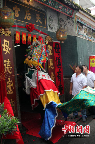 上午9點半,沙欄嚇村的吳氏宗祠前,吳姓老人們在祠堂內(nèi)向祖宗敬香。麒麟舞依然是主要的慶;顒。隨后,由兩頭矯健的麒麟帶隊,40多位吳氏村民組成的麒麟隊,連同他們吸引的大批村民和觀光客一同浩浩蕩蕩地繞村一周,為全村祈福迎祥。半個多小時后,游行隊伍在敲鑼打鼓和鞭炮齊鳴聲中抵達祭祀媽祖的天后宮。