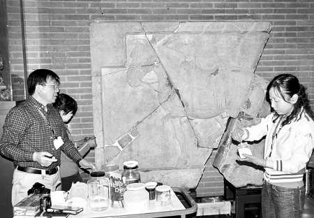 來自陜西唐大明宮遺址文物保護(hù)基金會(huì)的赴美代表和隨團(tuán)記者以及美方專家,共同見證了這一時(shí)刻。據(jù)西安專家組組長(zhǎng)楊文宗介紹:今天主要進(jìn)行的是補(bǔ)全工作,補(bǔ)全是文物修復(fù)工作中比較重要的環(huán)節(jié),在上一周及前期在國內(nèi)大量實(shí)驗(yàn)工作的基礎(chǔ)上,終于開始了補(bǔ)全工作的實(shí)施。前期試驗(yàn)段主要包括修補(bǔ)材料的選擇、采用工藝的確定等工作,待實(shí)驗(yàn)結(jié)束后,中美雙方專家就實(shí)施方案進(jìn)行了最終的敲定。今天的補(bǔ)全工作首先是使用加固劑對(duì)斷面進(jìn)行加固,其次是調(diào)制修補(bǔ)用的填補(bǔ)材料。今日開始,修補(bǔ)的部位主要為拳毛騧表面橫向出現(xiàn)的3條裂縫,約3.5米,颯露紫右下角、拳毛騧左下中部、左側(cè)面等幾處缺失做了填充修補(bǔ)。