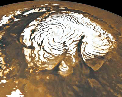 火星北極冰冠由冰和塵土層組成,厚約3000多米,覆蓋的面積略大于美國德州的面積。1972年,科學家觀察到了火星北極冰冠深谷和多螺旋低谷的地質(zhì)特征,并對它們的形成進行了推測。