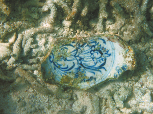 孟原召回憶,考古隊根據(jù)漁民提供線索發(fā)現(xiàn)該遺址,此遺址明顯經(jīng)漁民盜撈,表面散布圓形和不規(guī)則形盜坑,深約0.5-1米左右,為小艇螺旋槳吹打所致,海床翻動較大,表面散落元代德化窯瓷器、景德鎮(zhèn)窯卵白釉瓷器和青花殘片,及龍泉窯青釉瓷器,遺物分布較密集,采集到的瓷器有青花、青瓷、白瓷、醬釉等,年代有元、明兩個時期。