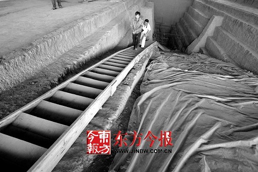 接著,工作人員在1號墓里發(fā)現(xiàn)了盜墓賊遺留下的墓道,一位大膽的電視臺攝像師鉆進墓道想一探究竟。他說,這個墓道直通2號墓,三四十米長,在接近2號墓時有一些碎石和浮土擋道,但可看到2號墓透出的光線。