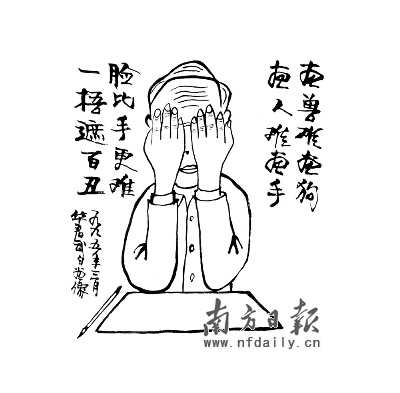 廖冰兄有一幅著名的漫畫《自嘲》,辛辣刻畫了一些人在“甕破”之后仍然瑟瑟發(fā)抖的形象。華君武也有一幅《自畫像》,但畫中人卻沒有露出面孔,華君武這樣風(fēng)趣地自嘲說:“我是畫不了素描的嘛,當(dāng)然也就畫不了自畫像。怎么辦?只好畫了一個(gè)人,雙手緊緊地把臉捂住。”