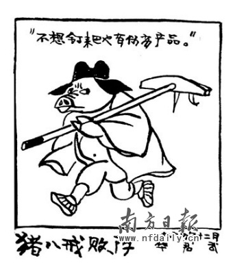 “文革”結(jié)束后,華君武出任全國美協(xié)副主席。這個(gè)時(shí)期華君武特別喜歡畫豬八戒。他認(rèn)為人性中的弱點(diǎn),豬八戒幾乎大都具備。上世紀(jì)80年代假冒偽劣產(chǎn)品出現(xiàn),他揮筆創(chuàng)作《豬八戒敗陣》,畫中的八戒之所以敗陣,就因沒想到連他用的釘耙也是假冒偽劣產(chǎn)品,因而打了敗仗。因?yàn)檫@一系列諷刺作品,有人形容華君武的漫畫是“刀刀見血,入木三分”。