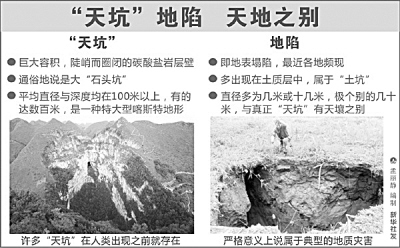 專家指出:“天坑”頻現(xiàn),這樣的用語足以駭人。然而根據(jù)地質(zhì)學(xué)定義,真正的“天坑”是指具有巨大容積,陡峭而圈閉的碳酸鹽巖層壁,通俗地說這是一種大“石頭坑”,其平均直徑與深度均在100米以上,有的達(dá)到數(shù)百米。它是一種特大型喀斯特地形。許多 “天坑”在人類出現(xiàn)之前就早已存在。