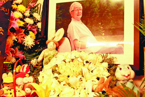 擺放在靈堂上的相片是華老的小兒子華方方在2005年春末拍攝的,就在自家樓下小花壇,一小枝綠色枝條,老人安詳?shù)男δ槪瑲忭嵣鷦,華老生前看過非常滿意。華老屬兔,他和兔子感情特別深,晚年更成了老小孩,睡床四周是大大小小的卡通兔、絨毛兔,他當(dāng)兔子王,F(xiàn)在這些兔子朋友環(huán)繞著他的遺像,華老一點都不寂寞,有兩只他最心愛的玩具兔還將陪他在墓地到老。