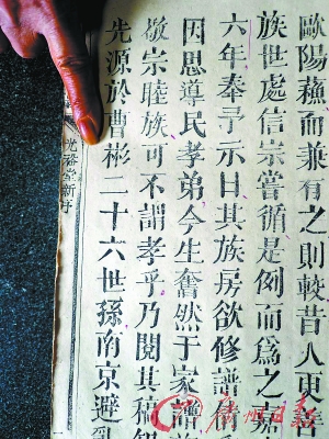 記者在這部由“同文堂字林書局”印制的族譜起初看到了這樣的記載:“先源于曹彬二十六世孫,南京避亂,世居北京真定府。迄宋之末,公達祖者因鄉(xiāng)科釋褐,后任選信豐縣正堂……”