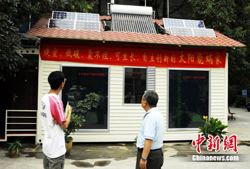 記者看到,這間鋼架結(jié)構(gòu)的房屋功能齊備,雖只有10余平米,但衛(wèi)生間、沐浴間、客廳、臥室一應(yīng)俱全。該房子的主人、退休工程師朱培世告訴記者,房子是由他和團(tuán)隊(duì)成員花了10個(gè)月左右的時(shí)間完成,屋頂上裝有4大塊太陽能板,屋內(nèi)的熱水、通風(fēng)、照明、供暖、甚至降溫都由這幾塊太陽能板提供的能量完成,是一座名副其實(shí)的太能房屋。其方倉建筑、儲冷降溫、太陽供暖、多功能窗、電池支架還獲得國家專利。
