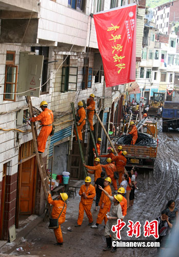洪災過后,江陵鎮(zhèn)熱浪逼人,但在街道上確是一派熱火朝天的場面,氣溫一直持續(xù)38℃以上的高溫,為了讓江陵鎮(zhèn)的受災群眾能及時用上電,成都電業(yè)局抗洪搶險突擊隊員們頂著炎炎烈日,揮汗如雨,認真地按照標準規(guī)范架設著每根電纜線。