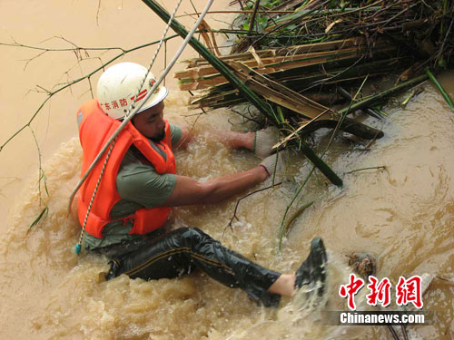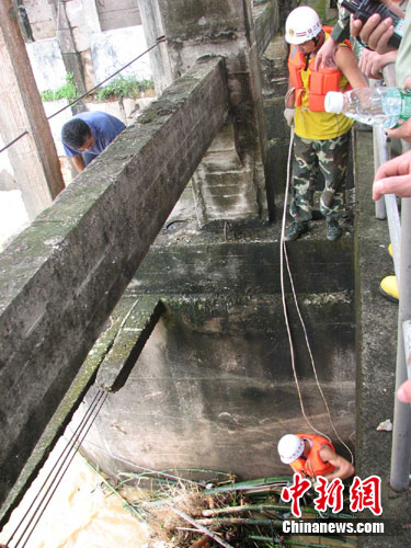 大壩閘門下,水深近6米,水流異常湍急,洪水也異常冰冷,且堆滿了垃圾,雖然消防官兵做好了安全保護,并關好閘門,下游也安排了漁船隨時準備救人,但是水下的情況不明,一不小心就有被洪水沖走或被水下雜物扎傷的危險。在其中靠近岸邊的一個孔閘門,大樹與竹子卡在閘門的中間,閘門無法放下,消防官兵只能在異常湍急的水流中作業(yè),由于缺少著力點,水下的消防官兵多次沒入水中,險象環(huán)生,經過近20多分鐘的作業(yè)才將雜物捆住。