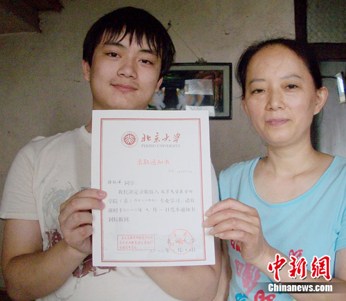 中新網(wǎng)重慶7月15日電 (連肖) 從徐仁洋接到北京大學(xué)的錄取通知書至今,母親楊治群已連續(xù)兩天晚上睡不著覺了!拔宜恢,一半是因?yàn)榕d奮,另一半則是惆悵!睏钪稳赫f,他們一家三口 “蝸居”在重慶一個(gè)月租200元的出租房里,固定經(jīng)濟(jì)來源是每月260元的低保費(fèi),家中連兒子去北京的路費(fèi)都拿不出來,更別說高昂的學(xué)費(fèi)了。