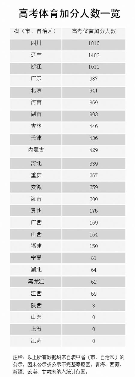 很多省份對(duì)體育加分項(xiàng)目并沒(méi)有做出詳細(xì)說(shuō)明,如福建、吉林,只標(biāo)明了“經(jīng)省教育廳、體育局認(rèn)定的國(guó)家二級(jí)以上運(yùn)動(dòng)員”;天津、新疆也未明晰具體體育項(xiàng)目。貴州和河南也只是簡(jiǎn)單地區(qū)分了“重大體育比賽”及“國(guó)家二級(jí)運(yùn)動(dòng)員(含)以上”。 實(shí)習(xí)生 周薇
