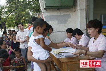 昨日7時許,家住石市新石小區(qū)的孟先生就帶著孩子來到橋西區(qū)婦幼保健站,不料前面已排起長隊,身后還陸續(xù)有家長帶著孩子趕來。