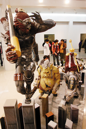 在展覽的最顯著位置,從川美畢業(yè)才兩年的“黃漂”王冕所做的雕塑作品“NEW YORK”引起了參觀者的格外關(guān)注,記者注意到,在這件作品中,唐僧的坐騎白龍馬加入了西方龍的造型,顯得有些面目可憎,而身上還貼滿了大眾、轟達(dá)等商標(biāo)。唐僧也成了蒙面人,孫悟空長(zhǎng)了四只手,豬八戒肥碩的手臂上蓋上了“驗(yàn)訖肉檢”四個(gè)大字,而走在最后的沙僧擔(dān)子上挑的也不再是行李,變成了麥當(dāng)勞和重慶百貨的購(gòu)物袋,四人如此游紐約,想起來(lái)就讓人忍俊不禁。