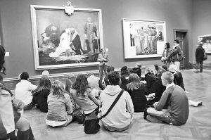 和中國的情況不同,歐美國家的中小學(xué)生則把去美術(shù)館視為平常之事,西方人從小就有定期參觀美術(shù)館、博物館等公共文化空間的習(xí)慣,而歐美國家的美術(shù)館、博物館也把為孩子服務(wù)看作最重要的工作之一。記者曾先后去過法國、英國采訪,發(fā)現(xiàn)無論是法國的盧浮宮、大皇宮國家美術(shù)館,還是英國的大英博物館、國家畫廊,到處都可以看到孩子的身影,而且不少是由學(xué)校組織帶隊(duì)參觀,甚至還有一些老師直接在美術(shù)館里為學(xué)生上課。