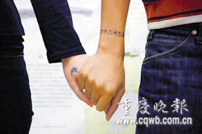 25歲的小海是墊江縣人,就讀于重慶大學B區(qū)土木工程學院。大四時,小海和同系女孩小麗相戀。一次,小海從網(wǎng)上了解到,國外不少戀人喜歡在各自的身體上文上相同圖案,以此表達愛意,他便和小麗同在左臂上文上了一個“龍”字!拔覀兠掷锒加羞@個字,文上它,誰都知道我們是一對。”
