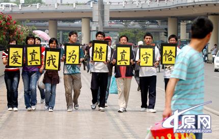 昨日上午,幾個(gè)來自中原工學(xué)院的大學(xué)生舉著“恪守真情為我真愛”的牌子出現(xiàn)在紫荊山廣場(chǎng)附近,他們選擇年輕人,特別是年輕情侶密集的地方活動(dòng),并請(qǐng)求他們?cè)谧约簻?zhǔn)備好的橫幅上簽名,支持自己“把第一次留給自己最愛的人”的觀點(diǎn)。