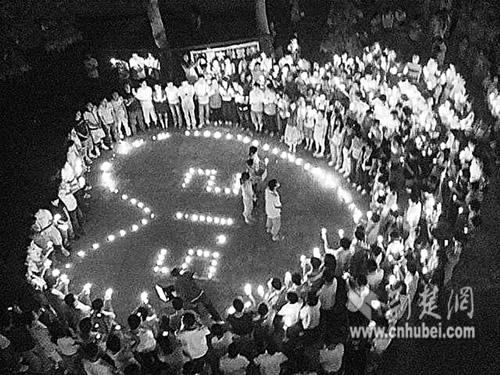 宿舍樓下,燭光組成大大的愛心和“5.12”字樣;500余名學(xué)生手捧蠟燭,為罹難同胞祈禱。前日晚,武漢工程大學(xué)武昌校區(qū)的一場畢業(yè)聚會(huì),顯得如此凝重。