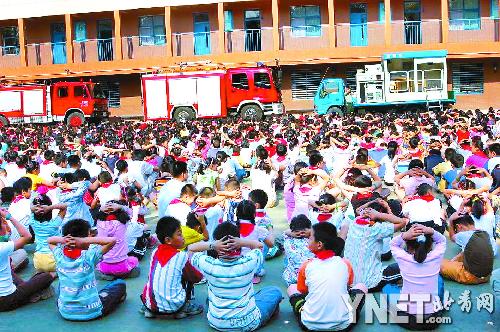 “發(fā)生地震了,如果來(lái)不及跑出教室,就立即躲到桌子下面或抱頭蹲到承重墻下,等短暫的地震過(guò)后,再迅速撤離教室。如果在衛(wèi)生間內(nèi)要找墻角抱頭蹲下!毙W(xué)生們?cè)谙拦俦笇?dǎo)下,都作出同樣動(dòng)作,在操場(chǎng)演練地震時(shí)逃生技能!耙郧安恢赖卣鹗鞘裁礃拥耐,四川地震以后我們學(xué)校老師也講了關(guān)于地震的好幾次課!彼哪昙(jí)的雯雯說(shuō),她學(xué)會(huì)了“抱頭在桌子或者承重墻下面蹲下”的避震知識(shí),回家要告訴爸爸媽媽。