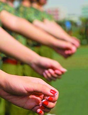 而從圖片中還可以看到,有的學(xué)生別出心裁地進(jìn)行了美甲,有的則對短袖的軍訓(xùn)服裝進(jìn)行改良——加裝了一對白色的袖套……