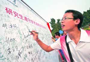 昨日(23日)下午,華南理工大學舉行第十五屆研究生文化節(jié)開幕儀式,本屆活動的“學術(shù)道德宣誓”和“千人學術(shù)道德大簽名”屬高校首創(chuàng)之舉,上千名研究生由研究生會主席帶頭舉行學術(shù)道德集體宣誓尤其壯觀,并在簽名板上簽名,以表達對學術(shù)抄襲的反對態(tài)度。