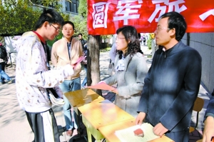 食堂門前的征兵現(xiàn)場(chǎng),一位大一新生說:“我剛參加完軍訓(xùn),太有意思了。但軍訓(xùn)時(shí)間太短,不過癮。我們的教官說,現(xiàn)在的兵營(yíng)和以前大不一樣,有很多高科技的東西。所以我想報(bào)名參軍!