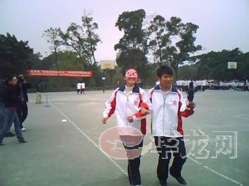 “什么都看不見,完全沒有方向感,心里感到很害怕!痹25米盲人短跑接力賽上,高(一 )17班的周玲同學剛下場就緊張地對記者說道。因為帶著眼罩,整個世界都是黑暗的,只能在摸索中前進,最后,在伙伴的帶領下周玲才走到了終點。