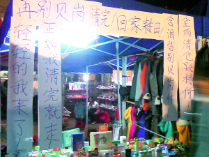 只見高高掛著的白色橫幅“再別貝崗,清完回家耕田”幾個字格外醒目,再加上“輕輕的我來了,正如我清完就走”、“含淚告別貝崗村,全場清倉跳樓價”兩幅對聯(lián)。而“靈堂”下的“祭品”卻是各種名牌護膚品。對此,不少人學生表示很迷惑:“怎么是白色對聯(lián)呀,應該用紅色才對吧?”隔壁攤位的老板極盡挖苦地說:“好像死了一家人,等著些錢買棺材似的!倍摗办`堂”的“堂主”,竟是來自華工的高才生,“因為沒有機會外出去實習,我們就通過這樣的方式來磨練自己。我們的樣子都這么慘了,大家一動心就會買的!眱蓚男生強調(diào),做市場營銷這一行,需要承受很多異樣的目光和心理壓力,這對他們來說是極大的鍛煉。