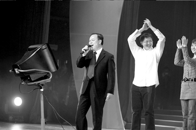略顯緊張的周校長(zhǎng)“喝口水”的要求得到滿足后,便從衣袋里掏出一張寫(xiě)有歌詞的白紙,正式開(kāi)唱。他手握麥克風(fēng),緊盯臺(tái)上的卡拉OK屏幕,高潮處他還會(huì)踮起腳尖“飆高音”。此時(shí),上任校長(zhǎng)許智宏微笑著坐在臺(tái)下,隨聲輕和。