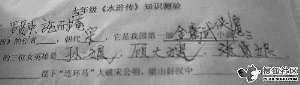 發(fā)帖者稱:最近在中學(xué)見(jiàn)習(xí),趕上學(xué)校在考關(guān)于《水滸傳》文學(xué)常識(shí)的卷子。幫老師批卷子的時(shí)候,孩子們超級(jí)富有想象力的答案囧翻了我們一屋子人。