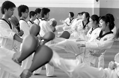 “嚯!哈!……”大學(xué)生會員們隨著口令,整齊劃一地踢腿。在一片白色的跆拳道服中,活躍的女生身影尤其顯眼,踢腿齊吼時,音量雖趕不上男生,氣勢卻不輸給他們。跆拳道俱樂部學(xué)生負(fù)責(zé)人楊城介紹,在400多人的注冊會員中,女生人數(shù)比男生還要多。