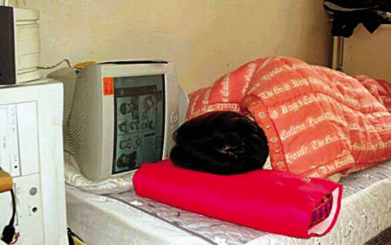 宿舍內(nèi)還有另外兩個室友留校,不過他們每天早出晚歸都很忙。沒過幾天,小謝就開始感覺到寂寞,自己好像被人遺忘了。呆在宿舍的生活也毫無規(guī)律,每天睡到中午一點(diǎn)左右,醒來時,空蕩蕩的宿舍里僅剩下他一個人,剛爬下床還沒來得及去洗手間,第一件事就很順手地打開電腦。隨便吃一包泡面,就開始了一天的電腦生活。晚上七點(diǎn)吃晚餐,有時泡面解決。玩電腦到深夜是必然的事,所以不能沒有宵夜。有時班上總會有男生煮東西,會一起吃,不然隨便吃點(diǎn)零食充饑。
