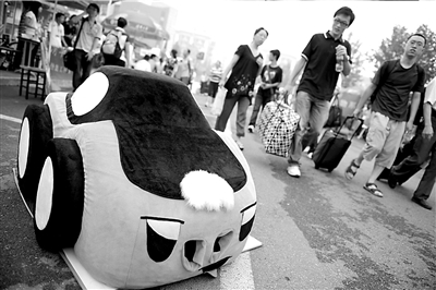 迎新現(xiàn)場,新生的班車一到,師哥師姐們便追車“搶人”。大鼓助興、統(tǒng)一著裝,大家各盡其能。汽車系的攤位前還擺上了一輛巨大的毛絨玩具汽車,格外醒目。