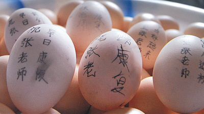 由于戴著口罩上課,張老師為讓學(xué)生們能夠聽清楚,經(jīng)常一句話要重復(fù)兩三遍,一堂課下來常常累得口干舌燥。即使是這樣,張小林仍然一直堅持著?粗鴱埨蠋煷髦懊婢摺鄙险n,初二一班的同學(xué)們悄悄湊了130個雞蛋,每個雞蛋上都寫著:“張老師,祝你早日康復(fù)!”“張老師,快點(diǎn)好吧”……學(xué)生余南瀾說,在班干部提議下,同學(xué)們每人拿兩個雞蛋送給張老師,一是祝福他,二是希望能為他補(bǔ)充營養(yǎng)。