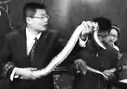 將一條長(zhǎng)達(dá)2米多、重達(dá)5公斤的蟒蛇抱到課堂上當(dāng)“模特”,教學(xué)生學(xué)習(xí)動(dòng)物寫生的技巧。武漢市第五十九中教師鄒華章抱蟒蛇上課的視頻,近日在網(wǎng)絡(luò)上瘋傳。從10月27日上網(wǎng)到昨日,共有400多個(gè)網(wǎng)站轉(zhuǎn)載這一視頻,其中在一家網(wǎng)站的點(diǎn)擊率已高達(dá)12.6萬(wàn)人次。