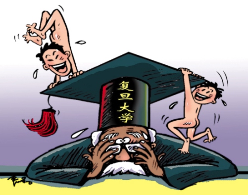 日前,兩名畢業(yè)在即的復旦男生,頭戴學士帽在校園內(nèi)裸奔慶祝畢業(yè),并拍照留念。 (昨日《羊城晚報》)