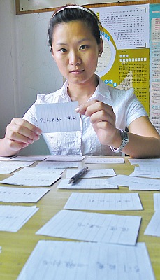 北方人難聽懂南方話,更難學(xué)重慶的地方土話!在萬州區(qū)龍沙鎮(zhèn)龍安村任村委黨支部書記助理的遼寧籍大學(xué)畢業(yè)生李飛就是其中一個(gè),她是去年考上我市的“村官”。在9個(gè)月的“村官”生活中,她因不懂當(dāng)?shù)赝猎掫[過笑話,遭過白眼。因此,她不停地觀看帶有重慶方言和土話的電視劇進(jìn)行模仿,寫了230頁土話“名片”隨身帶,天天念。