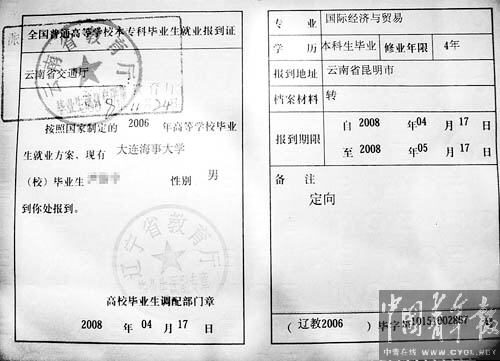 隨后,杜青拿到了學(xué)校發(fā)給他的《報(bào)到證》,報(bào)到單位為云南省交通廳,報(bào)到時(shí)間為2008年4月17日到2008年5月17日,《報(bào)到證》的“備注”一欄寫著“定向”。而此時(shí),他已經(jīng)畢業(yè)離開學(xué)校21個月了。