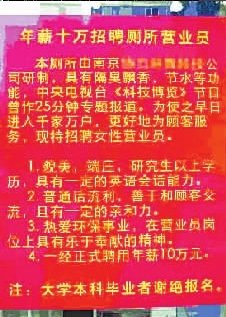 這條招聘啟事上商家自稱中央電視臺“科技博覽”曾經(jīng)作25分鐘專題報(bào)道。要招端莊,貌美,研究生以上學(xué)歷,具備—定英文會話能力,年薪10萬,謝絕大學(xué)本科學(xué)歷者報(bào)名。