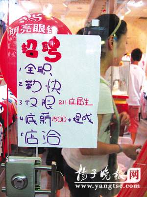 “招聘:全職,勤快,僅限211應屆生,底薪1500+提成,店洽”。這家名為“彩虹糖”的外貿(mào)服飾店門口貼出的招聘啟事20字左右卻沖擊力十足,其中“僅限211應屆生”部分還用紅色筆著重標出。