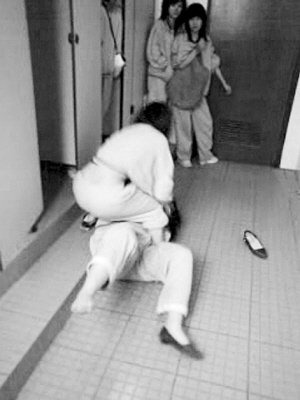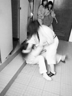 殷瓊是上海西南工程學(xué)校一年級(jí)學(xué)生。4月16日下午,她參加考試,題目差不多做完了,同學(xué)小成對(duì)她耳語(yǔ):“下課去校門(mén)口,有人找你談話!币蟓倹](méi)答應(yīng),小成幫她交卷,把她拉到校內(nèi)一幢大樓2樓女廁所門(mén)前,那里還有幾個(gè)女生在等著。拉扯進(jìn)廁所后,另一名同學(xué)劉幸一邊拍她肩膀挑釁,一邊讓其他女生打開(kāi)手機(jī)攝錄。視頻記錄了殷瓊的噩夢(mèng),殷瓊的母親向記者出示了這段影像: