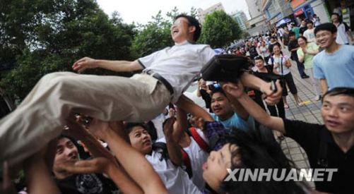 6月8日,學(xué)生們將班主任舉起歡慶,小偷(右下)趁機(jī)偷竊班主任手臂上的皮包。6月8日下午,2009年全國高考湖南考區(qū)考試結(jié)束。在長沙市一中考點門口,由于考生家長眾多,吸引了趁亂行竊的小偷。其中一群考生在將班主任高高舉起慶祝之際,一名小偷趁亂偷走了班主任的皮包。師生和記者發(fā)現(xiàn)皮包丟失后,根據(jù)記者提供的圖片尋找小偷,但小偷已逃之夭夭。新華社記者李尕攝