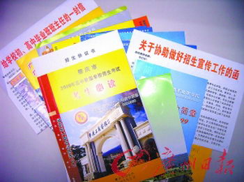 讓人瞠目結(jié)舌的是,肇慶某職校還給畢業(yè)班的班主任寄來一份格式嚴謹?shù)摹墩猩鷧f(xié)議書》,措詞規(guī)范,且蓋有公章。其中“甲方”是職校,“乙方”是有意“加盟”的老師,約定“甲方按每名學生3000元的標準計付勞務(wù)費給乙方,并即時(學生報到時)現(xiàn)金兌付……乙方給甲方一年內(nèi)招生超過50名,甲方贈送目前最先進的IBM手提電腦一臺給乙方;招生超過100名,獎現(xiàn)金人民幣5萬元。”