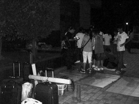 當(dāng)時(shí),大部分學(xué)生帶來(lái)的錢(qián)已經(jīng)用完了。有的一整天沒(méi)吃飯,有的連回家的路費(fèi)也不夠了。晚上10點(diǎn)半, 20多個(gè)學(xué)生蜷在中信國(guó)際大酒店停車(chē)場(chǎng)的綠化帶邊,打起了地鋪,身邊堆滿(mǎn)了大大小小的行李。14名女生和9名男生(除9人外,還有4名男生滯留其他地方)流落街頭。