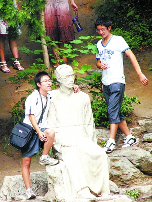 為了留下記憶,很多游客爭相和校園內(nèi)的雕塑合影!鞍沧痹诤商烈唤堑摹爸熳郧逑壬狈浅J芮嗖A。有的游客和“老先生”勾肩搭背,更有甚者,直接坐在“老先生”腿上照相。