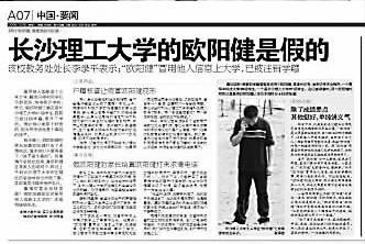 26日湖南某報(bào)的追蹤報(bào)道稱,25日晚上,華中科技大學(xué)的歐陽健說,長沙理工大學(xué)的“歐陽健”家長打來電話,要求他們不要再繼續(xù)追查。
