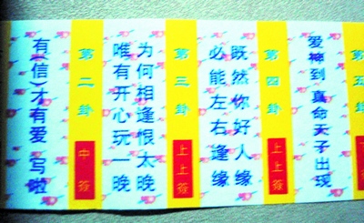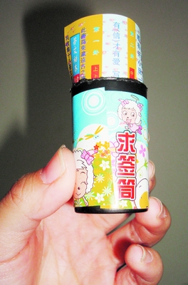 記者打開“求簽筒”,看到所謂“簽文”上寫有“恭喜,恭喜,你終于有喜”等內容。記者仔細看了一下,竟發(fā)現(xiàn)“簽文”中有不少錯別字。