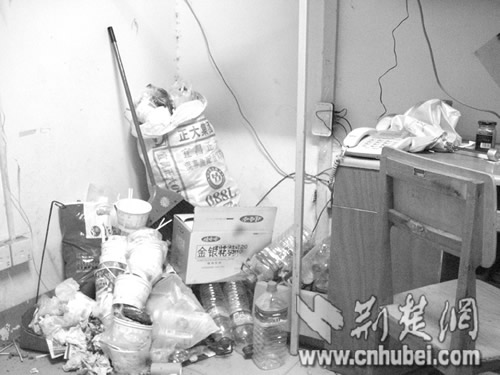 據(jù)記者了解,B棟所住的均為該校的男大學(xué)生。這行粉筆字寫(xiě)在樓道的地上,記者趕到時(shí),字跡已經(jīng)十分模糊了。在知情學(xué)生的指引下,記者進(jìn)入6樓一間寢室。一進(jìn)門(mén),一陣怪味就撲面而來(lái)。四下仔細(xì)一看,寢室門(mén)后一個(gè)高近一米的垃圾堆赫然出現(xiàn)在記者眼前:用過(guò)的飯盒、塑料袋,甚至是煙頭、飲料瓶,各式垃圾堆滿(mǎn)一地。但在這種環(huán)境下,寢室里的4個(gè)男生卻好像絲毫沒(méi)有察覺(jué),上網(wǎng)、看書(shū)不亦樂(lè)乎。該寢室學(xué)生小程告訴記者,他們每天的學(xué)習(xí)任務(wù)都比較重,課余時(shí)間一些同學(xué)又流連網(wǎng)絡(luò),因此大家平時(shí)都不愿意做清潔,寢室里形成這么個(gè)垃圾堆也“不足為奇”。“不過(guò)通常我們隔一個(gè)月會(huì)清除一次的!毙〕陶f(shuō),冬天把垃圾堆在寢室里也沒(méi)多大關(guān)系,夏天會(huì)清除得比較及時(shí)。而小程所說(shuō)的“清除”,就是把垃圾從室內(nèi)掃到寢室門(mén)口堆放,等宿管做清潔的時(shí)候一并清理。“其實(shí)我們的生活垃圾是應(yīng)該自己拿到樓下的垃圾桶里扔掉的,但很多同學(xué)為了省事,就直接把垃圾堆在門(mén)口,這樣增加了宿管做清潔的勞動(dòng)量,最后才發(fā)生了她們寫(xiě)‘大字’抱怨的事情。”