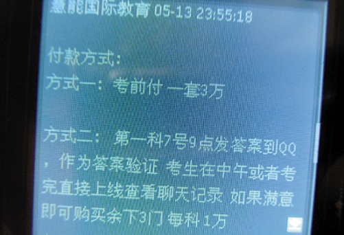 該網(wǎng)站還聲稱,他們對(duì)高考題及答案有一套“采集路徑”。據(jù)稱,他們有12名工作人員在各考區(qū)參加考試,并在考試中通過(guò)無(wú)線針孔攝像頭拍攝試卷,通過(guò)無(wú)線傳輸設(shè)備傳出場(chǎng)外,再由8名專業(yè)在校老師分工做題。答案將通過(guò)阿里旺旺和msn,在開考后30分鐘至考試結(jié)束前45分鐘發(fā)送至購(gòu)買答案的考生QQ群內(nèi)。由考生找人在考場(chǎng)外看答案,用對(duì)講機(jī)給戴有防屏蔽耳機(jī)的考生念或者用電腦發(fā)送到看字設(shè)備上。